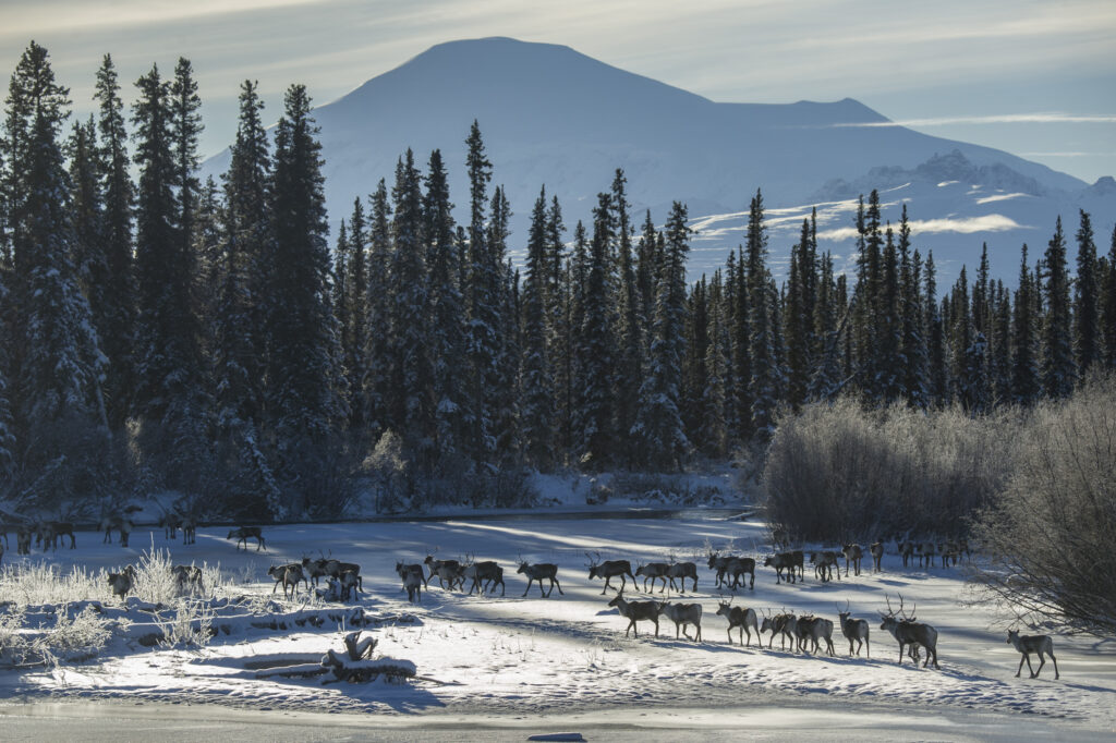 I knew from past migrations that the freezing rivers naturally funnel the caribou to this big bend in the Copper River Basin. The river, frozen on both sides, was still open in most places down the middle. I had located four likely places on the big bend where caribou had crossed, places with enough cover for a photo ambush. I moved between my ambush points to stay warm and pack down the trail between them so I could quickly move from one to another. I think about others who had probably waited along the big bend in the Slana River to ambush caribou, Ahtna hunters. Just yards away there are old blaze marks on big spruce trees marking the trail from the mouth of the Slana River to Batzulnetas village about five miles upriver. In 1848 Ahtna warriors killed the entire group of Russian Soldiers near Batzulnetas. On most days I saw no caribou. The caribou was painfully slow, but action could come at any moment.
