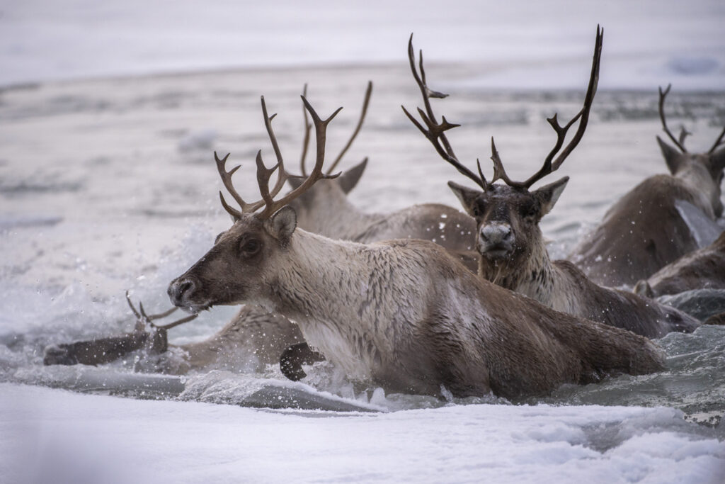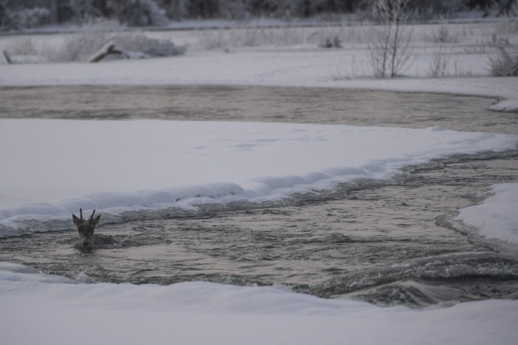 Of course more often than not the caribou would decide to cross where I wasn’t. With tripod and camera over my shoulder I hurried down my trail trying to get in camera range. Out of time and breath, I planted the tripod like a mono-pod into the snow and clicked away as they plunged in and swam across.
