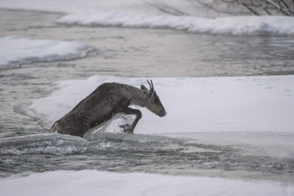 When I first noticed the caribou calf, it was in the river being carried past me by the current. He managed to climb onto an ice island in the middle of the river. After a couple of minutes he struggled to stand. Even though exhausted, the six month old calf, separated from his mom, was pressed by the urge to keep going. Walking to the edge of the ice he stepped in with a plop and swam across the ten feet of open water but did not attempt to climb out. Instead he turned back to the island, climbed out, laid down and curled up.