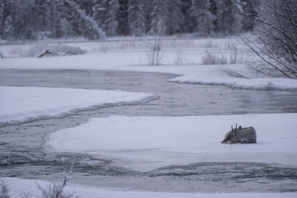The calf was in trouble. I stayed hidden knowing if he saw me now he might panic and jump back into the dangerous river. Resting now would increase his odds for survival. The six month-old calf was still asleep on the ice as the winter light faded. As I slowly moved away my gut told me this young caribou was a survivor.