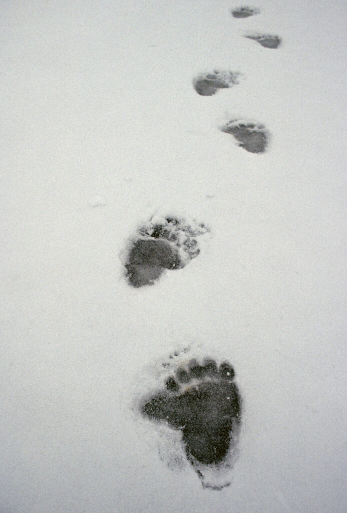 The “simple life” they had come in search of would never mean “easier.” Luxuries were few, but there was time for grayling fishing in nearby Natat Creek. On this particular day, Deirdre had dinner in mind as she crept through the brush toward her favorite hole, careful not to spook a small school of grayling. About to cast her lure into the greenish, yellow stream, she glanced down. The tracks of a big grizzly pressed deep into the muddy bank slowly materialized. Grayling forgotten, Deirdre rushed up the creek to Glen Helman’s homestead. Flushing with the excitement of her first “bear encounter,” she quickly told Glen, “There’s been a bear down at my fishing hole,” to which Glen casually replied, “Deirdre, it isn’t your fishing hole.” Deirdre didn’t have bear problems. But the summer of 2001 found her small bush cabin vacant for the first time. She had gone outside for the first time in fifteen years. I wasn’t surprised to see the big grizzly prints in the mud as I hiked the trail to check on the cabin belonging to Marie and Jim Morris, Deirdre’s daughter and son-in-law. Easily recognizable, this bear left the biggest tracks in the settlement. I had never met the grizzly that made them. Few had.