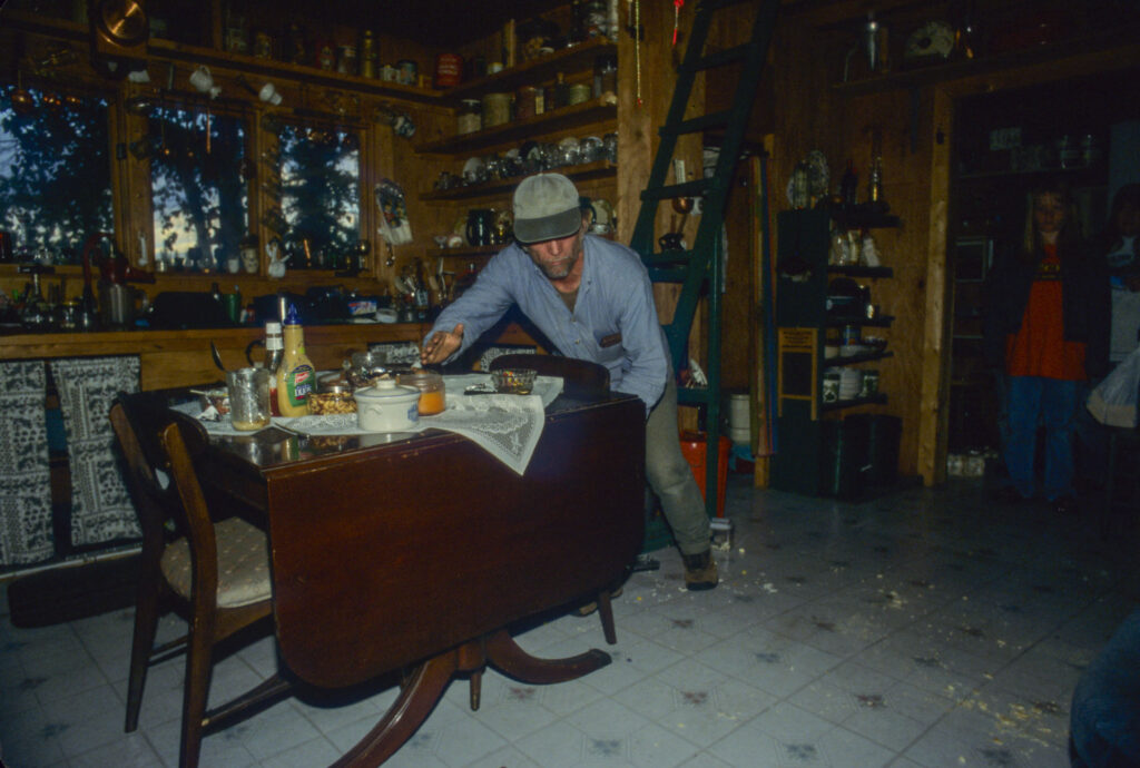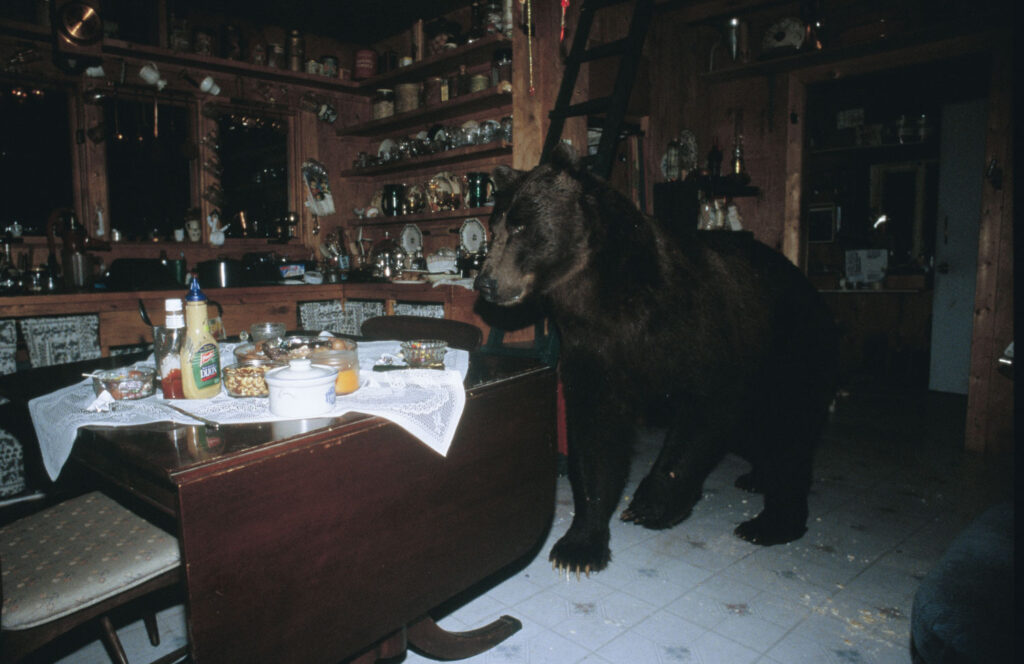 Bear problems were not new around the settlement. All the abandoned homesteader shacks had long since had their doors broke down and the food caches raided. Sometimes the four-pawed vandal just came and went through the door. Just as likely, he would enter or leave through a large window or, if it suited him, right through the wall. It was all the same to the big, shy grizzly. His fame grew. The bear seemed to enjoy rearing up with both front paws to cave in doors and tailgates. It was bears, of course, that caused the most problems, but then, weren’t they just taking advantage of homesteader mistakes? Leaving food in a vacant cabin. My flash batteries would not last a full 24 hours, so every morning and evening I made my way down the forest trail to Deirdre’s cabin. I moved slowly, watching and listening for sounds that might betray the grizzly’s presence at the cabin. Every morning I feared he wouldn’t come back while simultaneously fearing that he would. On the third morning, there were fresh tracks! He had come back. From a distance, I could see the cabin door was open, and my heart pounded. As I flipped the safety off, I feared I had missed the picture even more than I feared he might still be here. There was a big muddy track smack in the middle of both doors. Inside, nothing seemed to have been moved at all. I walked into the kitchen and through the beam, triggering the camera. The flash didn’t fire. But had the film advanced during the night? The camera frame counter said it all—two frames had been exposed. I quickly rewound the film and reloaded the camera. Then I noticed the scratches in the linoleum tiles. Like tracks in the snow, these marks told the story. The grizzly bear had walked right up to the table, the camera clicked, the flash fired, and he bolted out the door for parts unknown. I changed the batteries and quickly left. For two more weeks I kept the camera system operational in Deirdre’s cabin and waited for my roll of film to return from the lab. The bear didn’t return. But accounts of destruction from the far side of Mount Suslo told of his whereabouts. I had rarely been so anxious checking the results of a box of slides. The roll contained some two dozen pictures of Deirdre’s kitchen table. Most were test shots I’d triggered each time I returned to change flash batteries, just to make sure the system was working. But there was one slide identical to all the rest, except for one thing—it was the one I’d imagined before I set up the camera! Looming big and unbelievable, Deirdre’s grizzly stood at the kitchen table deciding which dish of candy to steal.