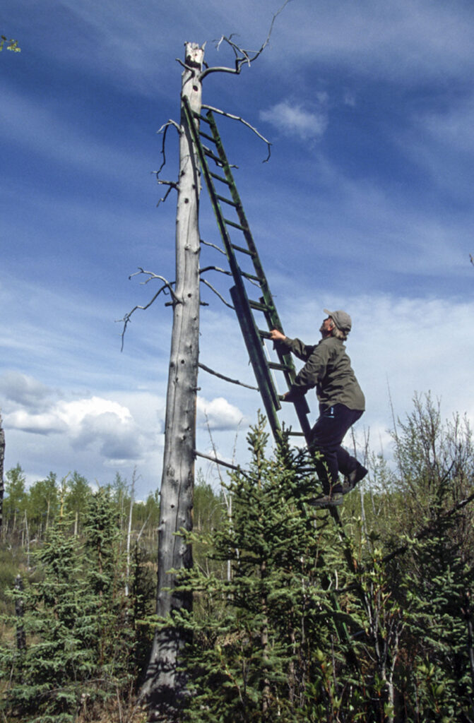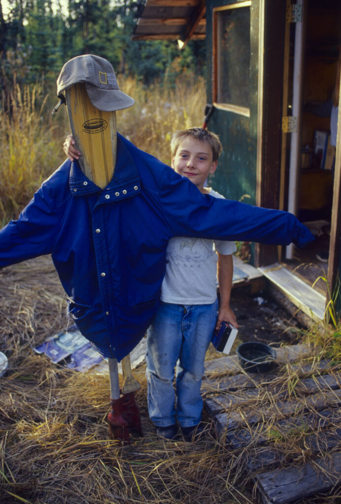 The grass had grown tall in Jim and Marie’s yard during this summer, nearly obscuring their enviable fleet of snowmobiles. But what I saw next stopped me in my tracks. The door was open into their arctic entry and pantry and had taken a direct hit. Fearing I’d blundered into the scene of a crime in progress, I searched the thick, young spruce for his dark form. I remember wishing I’d brought my bear spray, no, make that my .338 Winchester magnum. Bear trails, spoking out from the pantry into the trees, were littered with ripped, smashed and crunched boxes of cake mixes, spices, and a Crisco can. There were other cans, punctured, tasted, rejected. Apparently anything the bear wanted to give a try was hauled out to the yard. Empty packages of graham crackers, chocolate chips, and marshmallows lay close to the door. He seemed to like s’mores! Marie’s mom, Deirdre, lives just 100 yards down the trail. I checked her place next and discovered that the bear had pushed her pantry window into the cabin, where it lay unbroken on a sofa. I knew my kids would want to see all the havoc the bear had caused, so with them in tow, I later returned to clean up and nail a piece of plywood over Deirdre’s window opening. Two days later, we were back to again clean up Jim and Marie’s yard and arctic entry. We salvaged what we could, filling up a couple of large boxes. Everything else went into garbage bags. We packed everything to go. Before leaving, we built a decoy using a jacket, a canoe paddle, and my hat. We left it guarding the door.