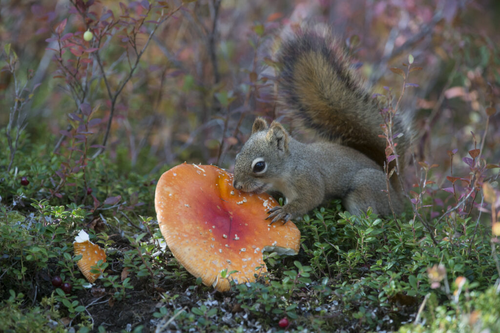 Red squirrels are naturally shy and cautious, ever alert for predators such as lynx and northern goshawks, specialists in hunting these tough rodents. Red squirrels have the ability to eat toxic mushrooms including these (Amanita muscaria)