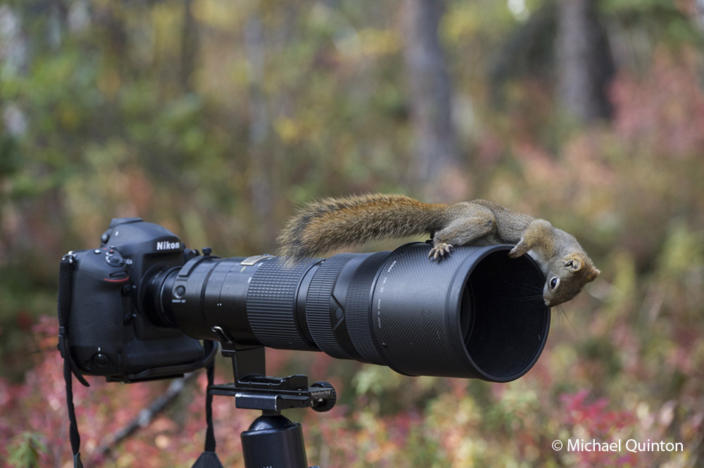 Photographing red squirrels is fun but challenging. I photographed the squirrels for more than a month to get these photographs. Sometimes the curious red squirrel is more interested in checking out my equipment than carrying on with its important work.