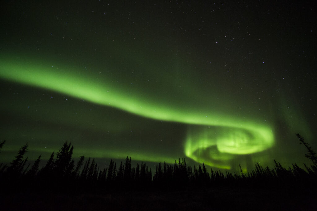As bands of green aurora above the northeast horizon warmed up, a bear worked his way through twisted and stunted silhouettes of stunted black spruce. Air currents, rich and spicy, drifting from the cabin.